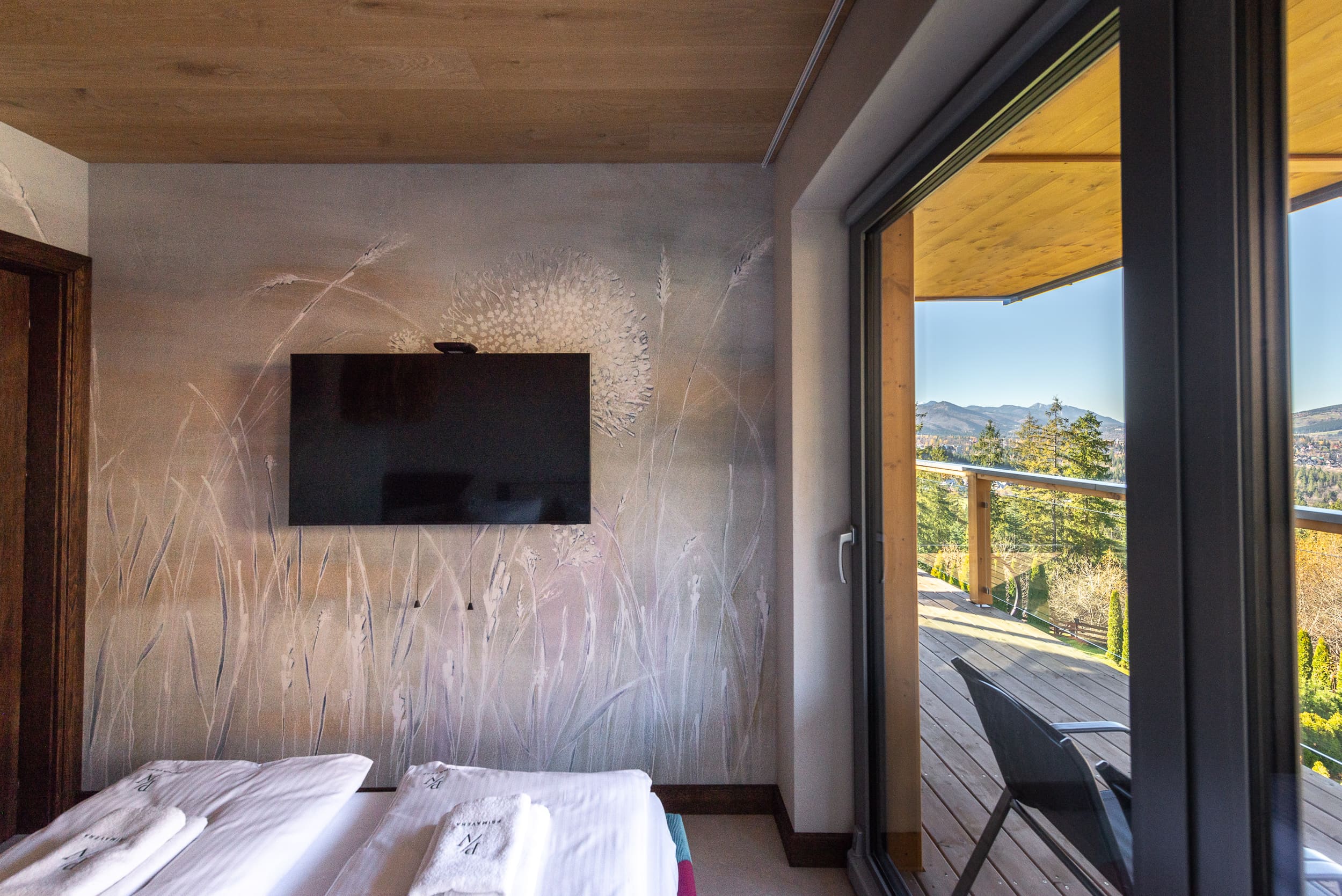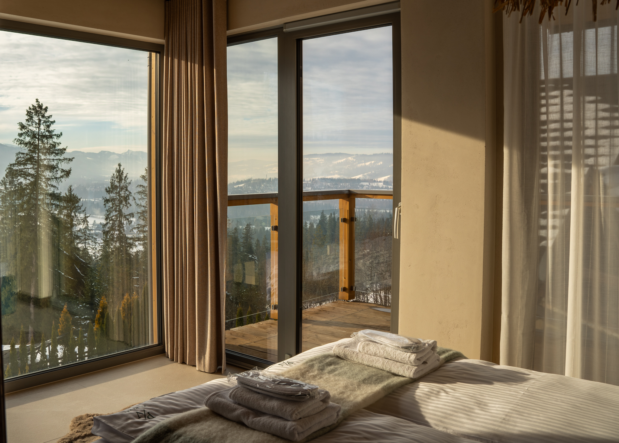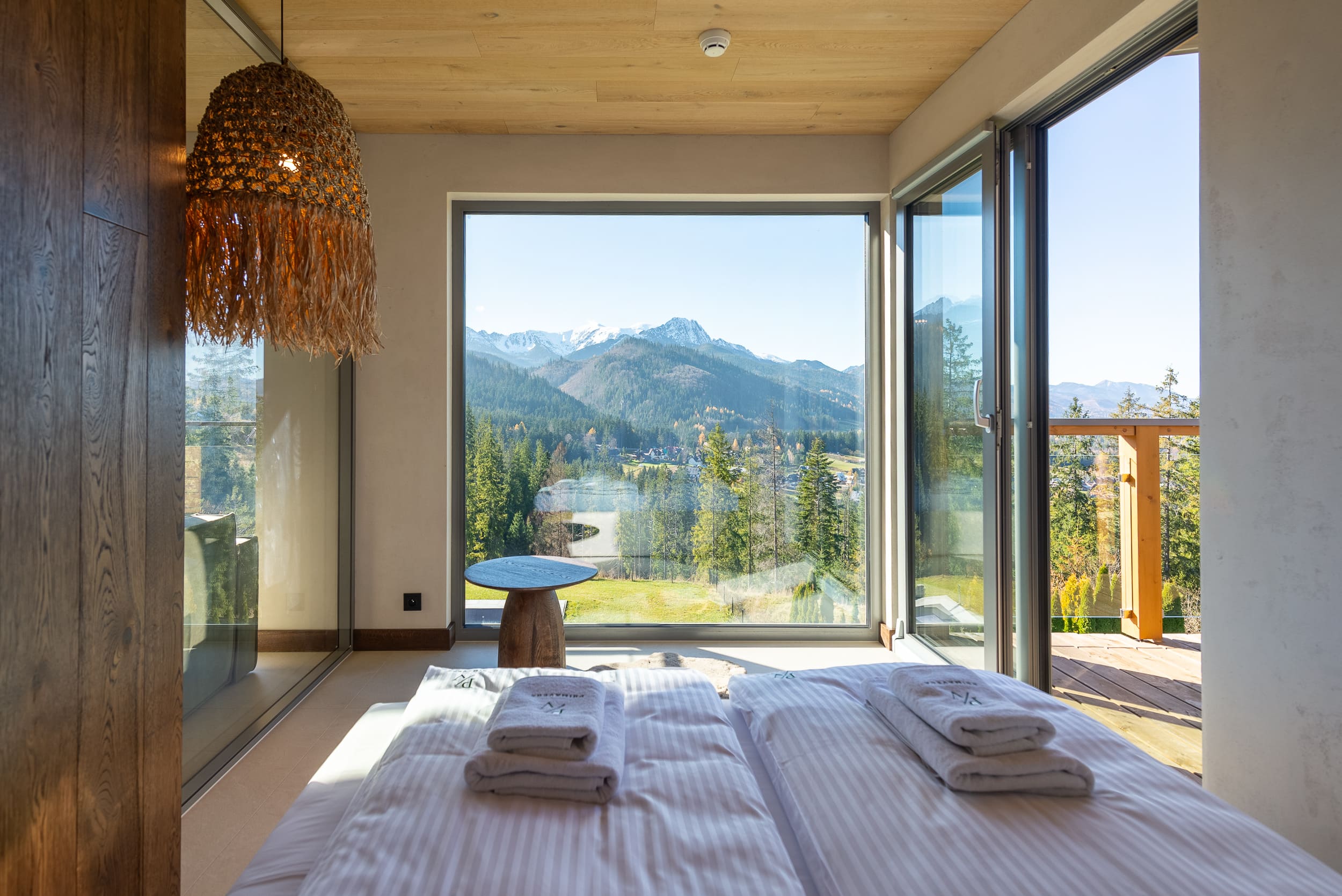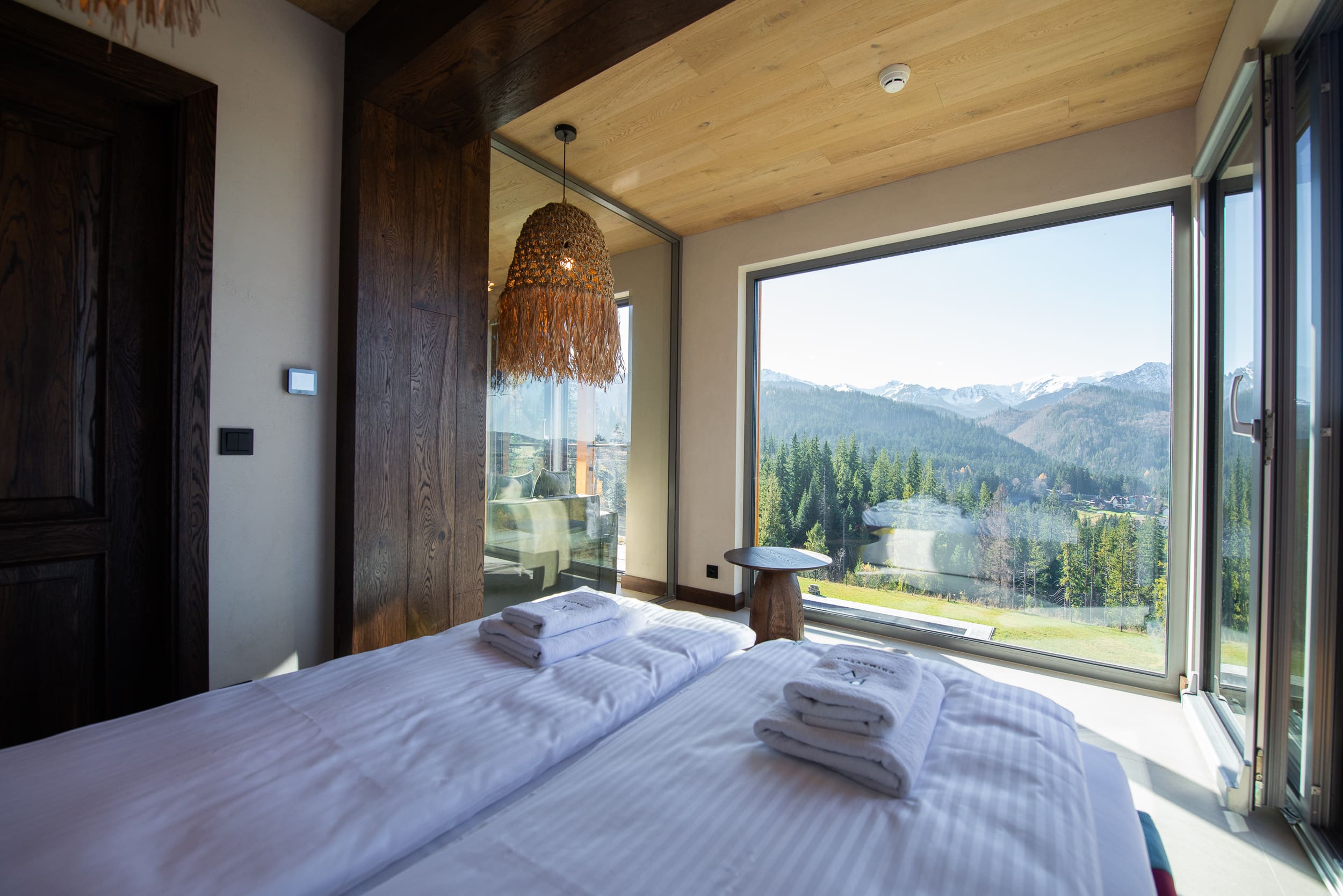 Sypialnia z panoramicznym przeszkleniem i wyjściem na taras, dzięki czemu budzisz się z widokiem na Tatry. Komfortowe łóżko, nastrojowe oświetlenie i wykończenie premium tworzą idealną przestrzeń na spokojny odpoczynek.