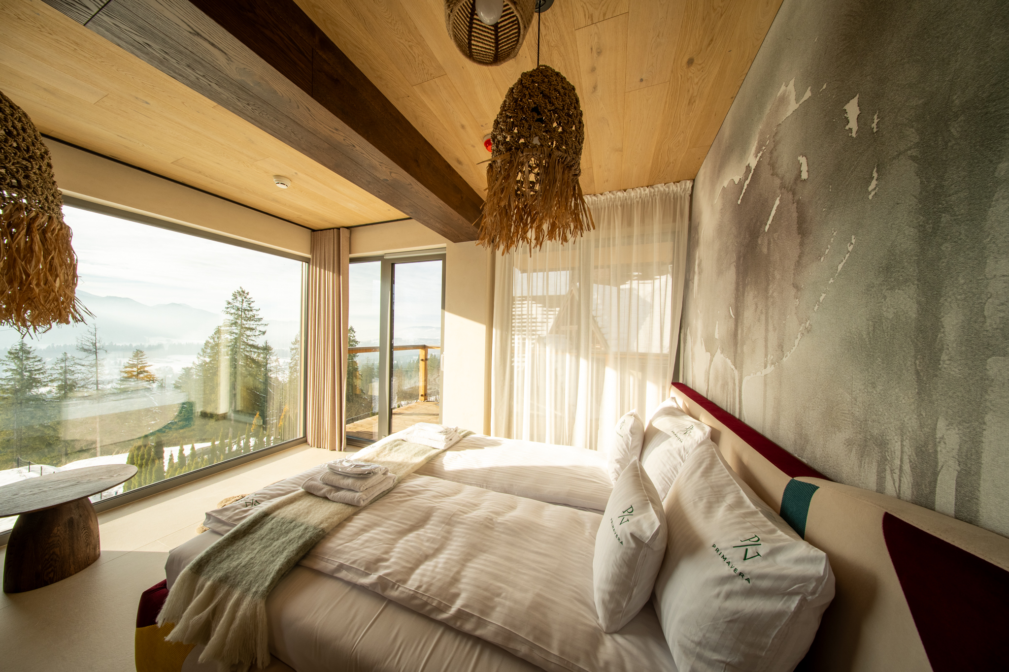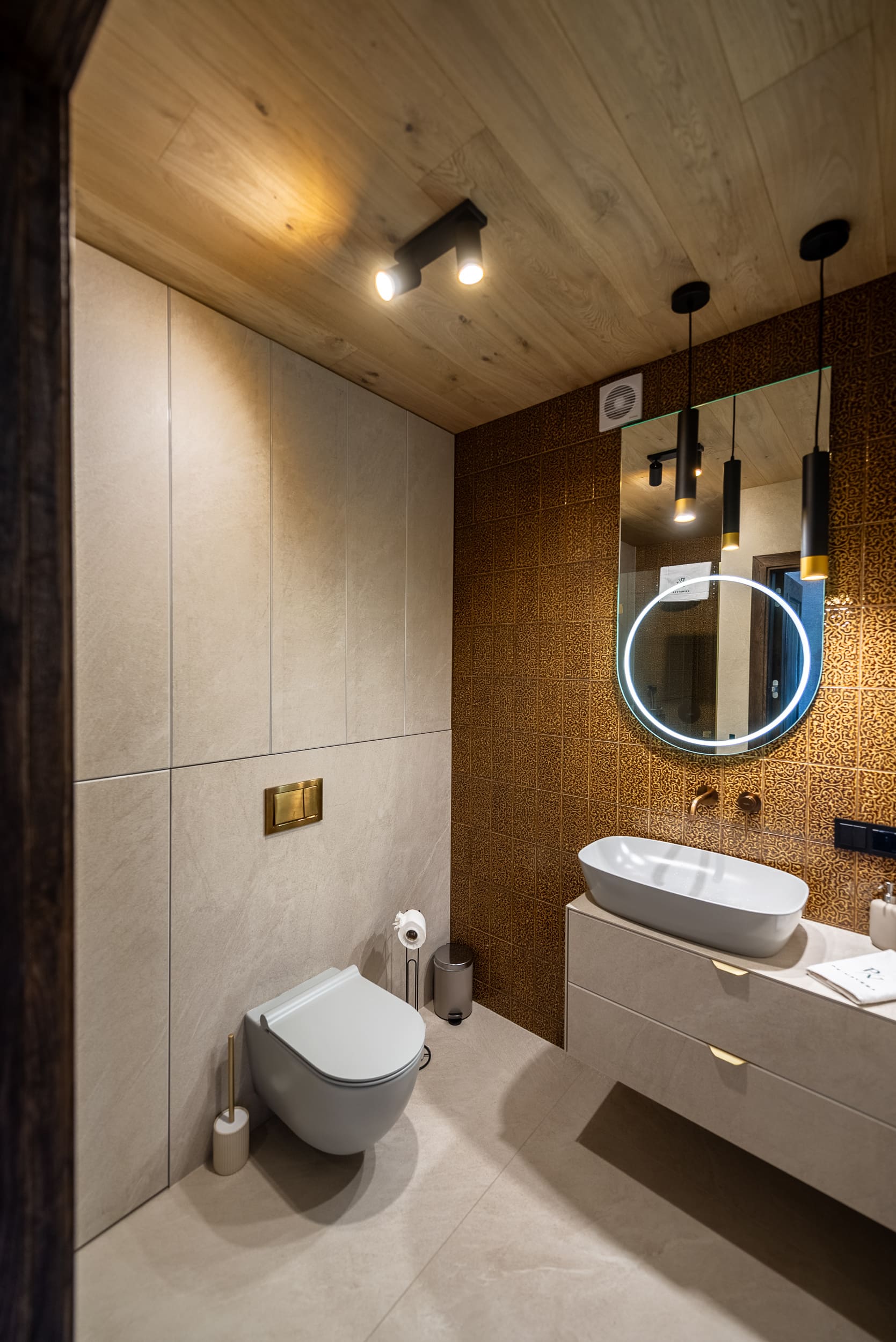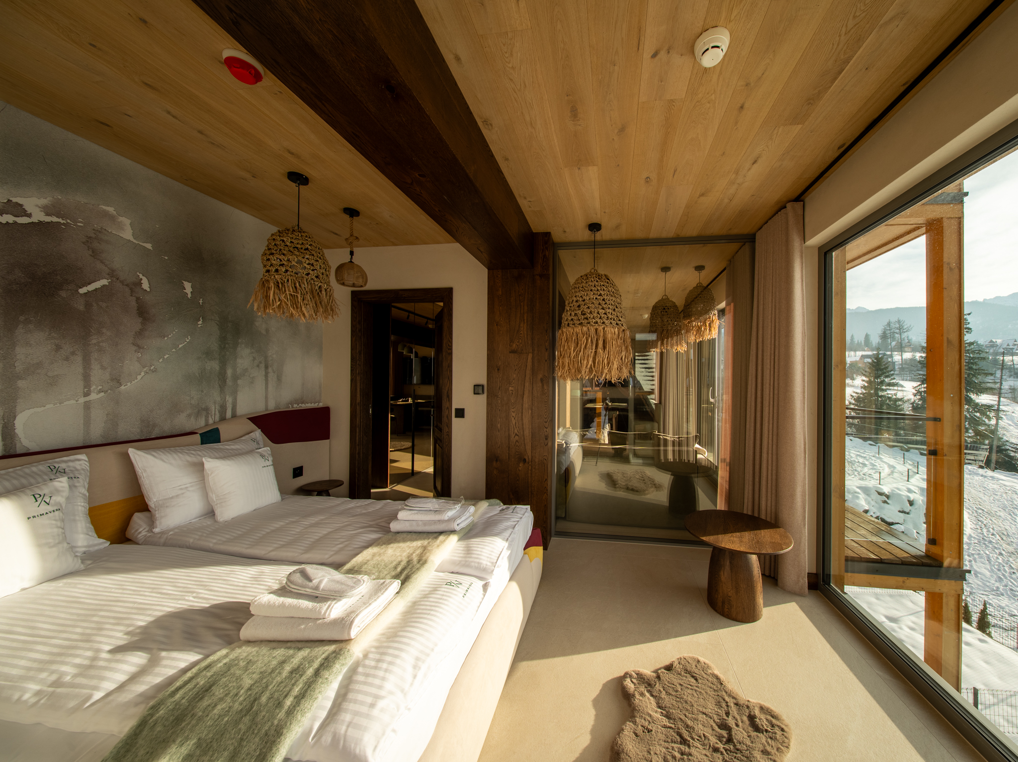 Kameralna, elegancka przestrzeń z komfortowym łóżkiem i nastrojowym oświetleniem. Dopracowane detale budują spokojny klimat, a wyjście na taras pozwala cieszyć się górskim powietrzem i widokiem.