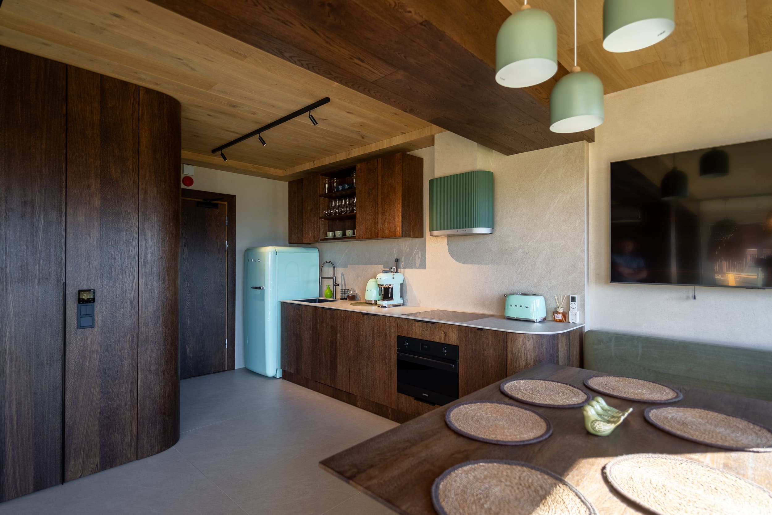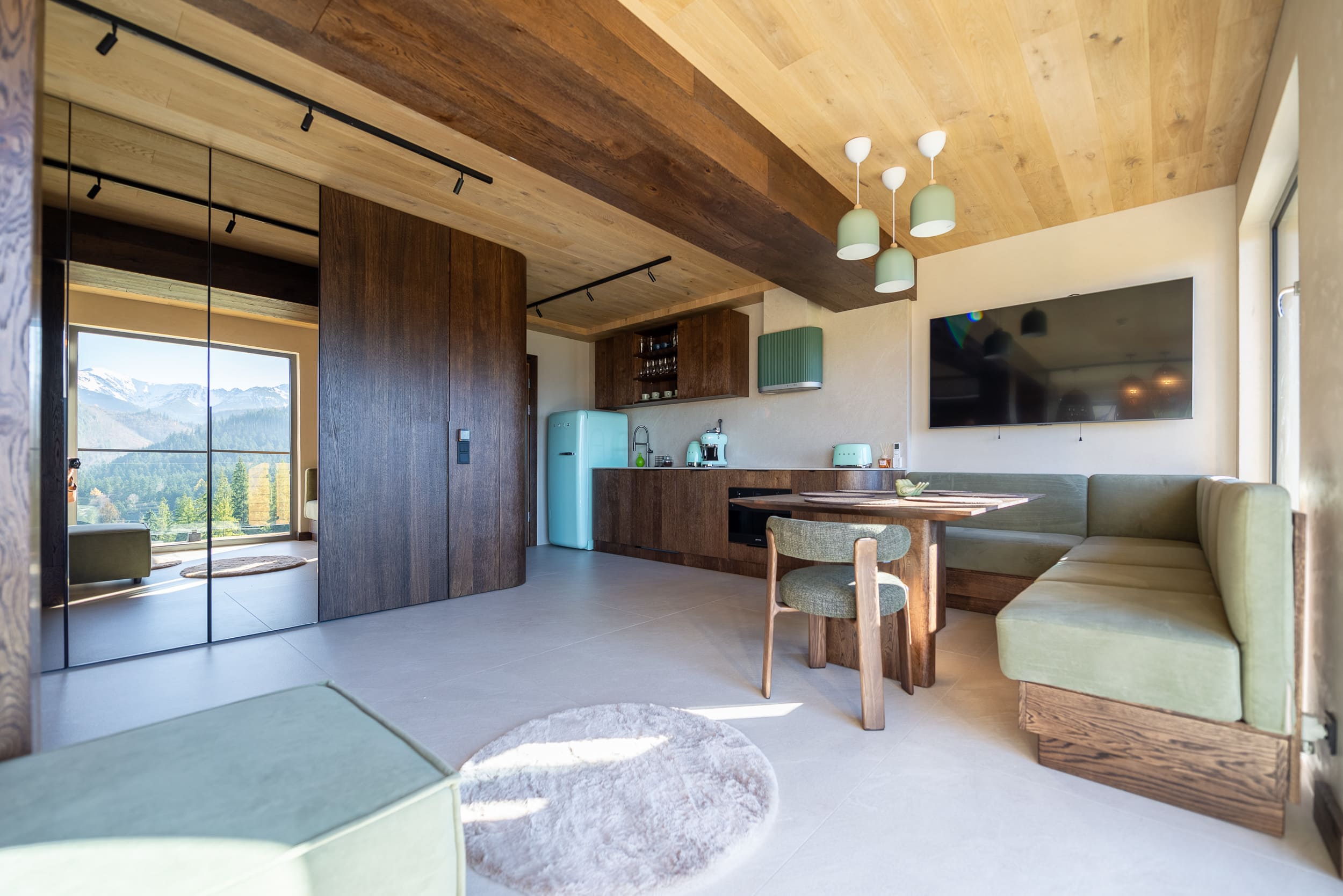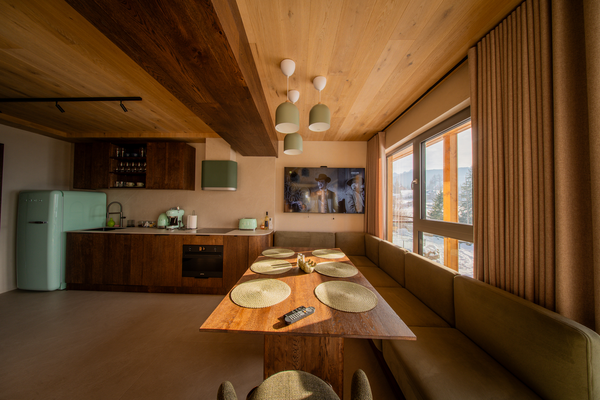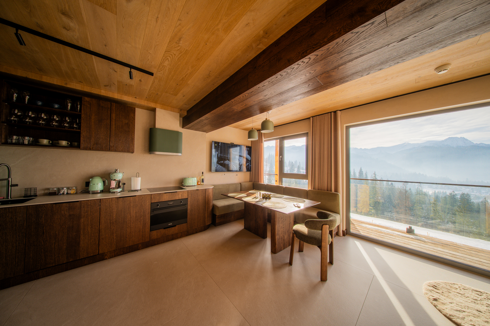 Nowoczesna, w pełni wyposażona kuchnia z elegancką zabudową i dużym blatem do wspólnego gotowania. Przemyślana strefa jadalniana przy oknie oraz detale w stylu premium sprawiają, że poranki i kolacje z górskim widokiem mają tu wyjątkowy klimat.